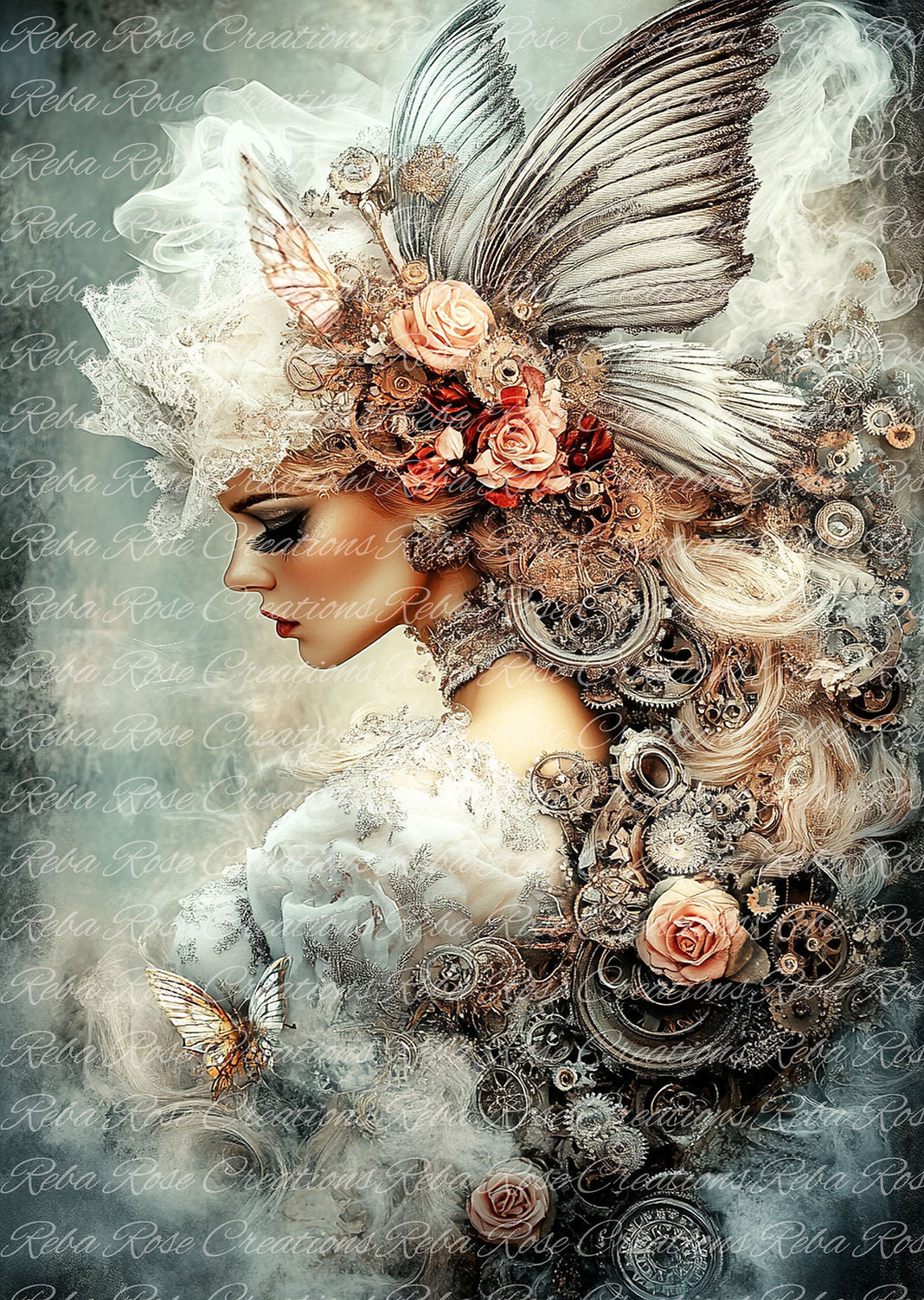 Reba Rose Creations, Rice Paper for Decoupage, Mixed Media, Elegant, Steampunk, White Beauty Woman, Lady, Floral, A4 8.27 X 11.6