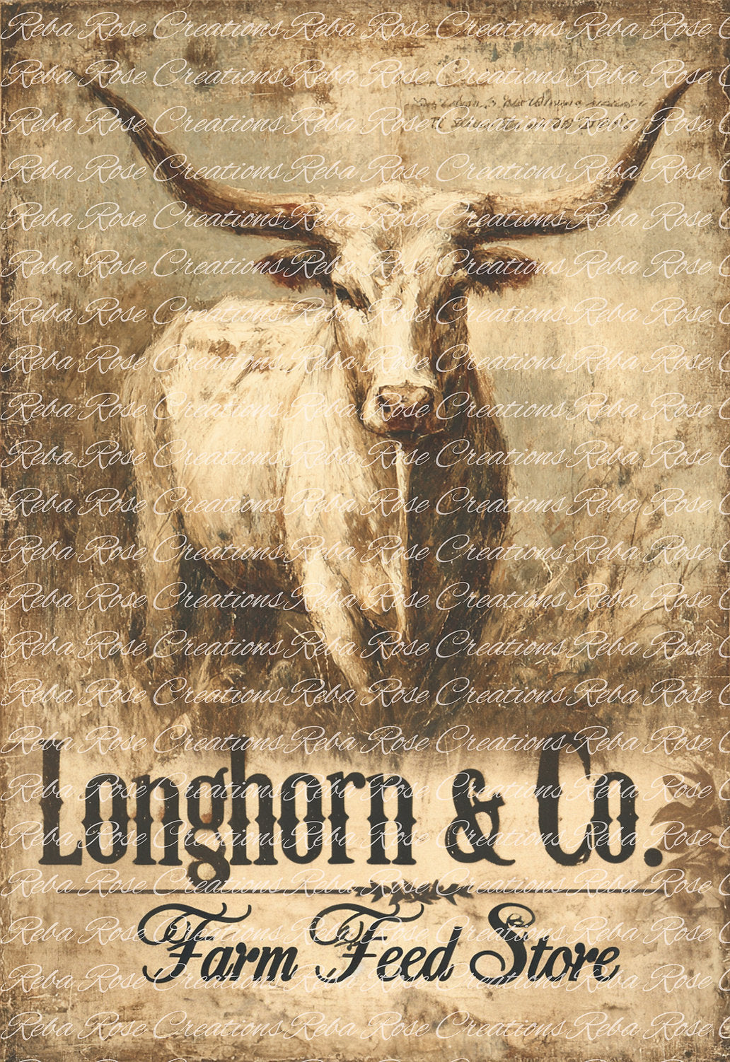 Reba Rose Creations, Rice Paper for Decoupage, Mixed Media, Farmhouse Longhorn, Cow, Country, A3, 11.7 x 16.5