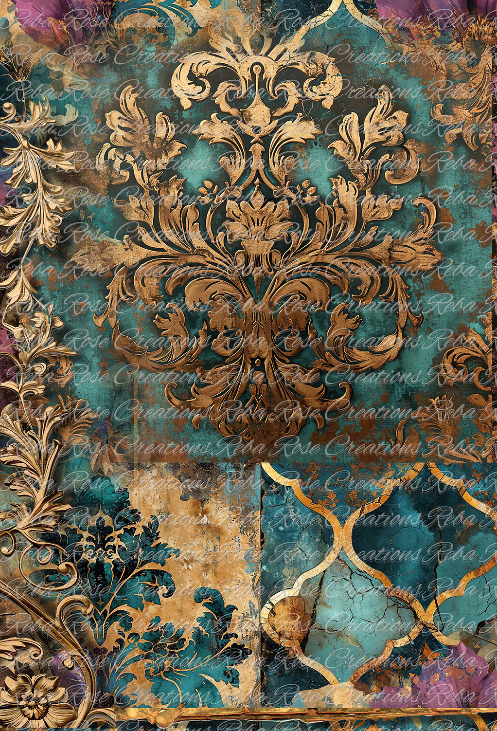 Reba Rose Creations, Rice Paper for Decoupage, Mixed Media, Gold, Turquoise, Damask, Wallpaper, Background, A3-152, 11.7 x 16.5