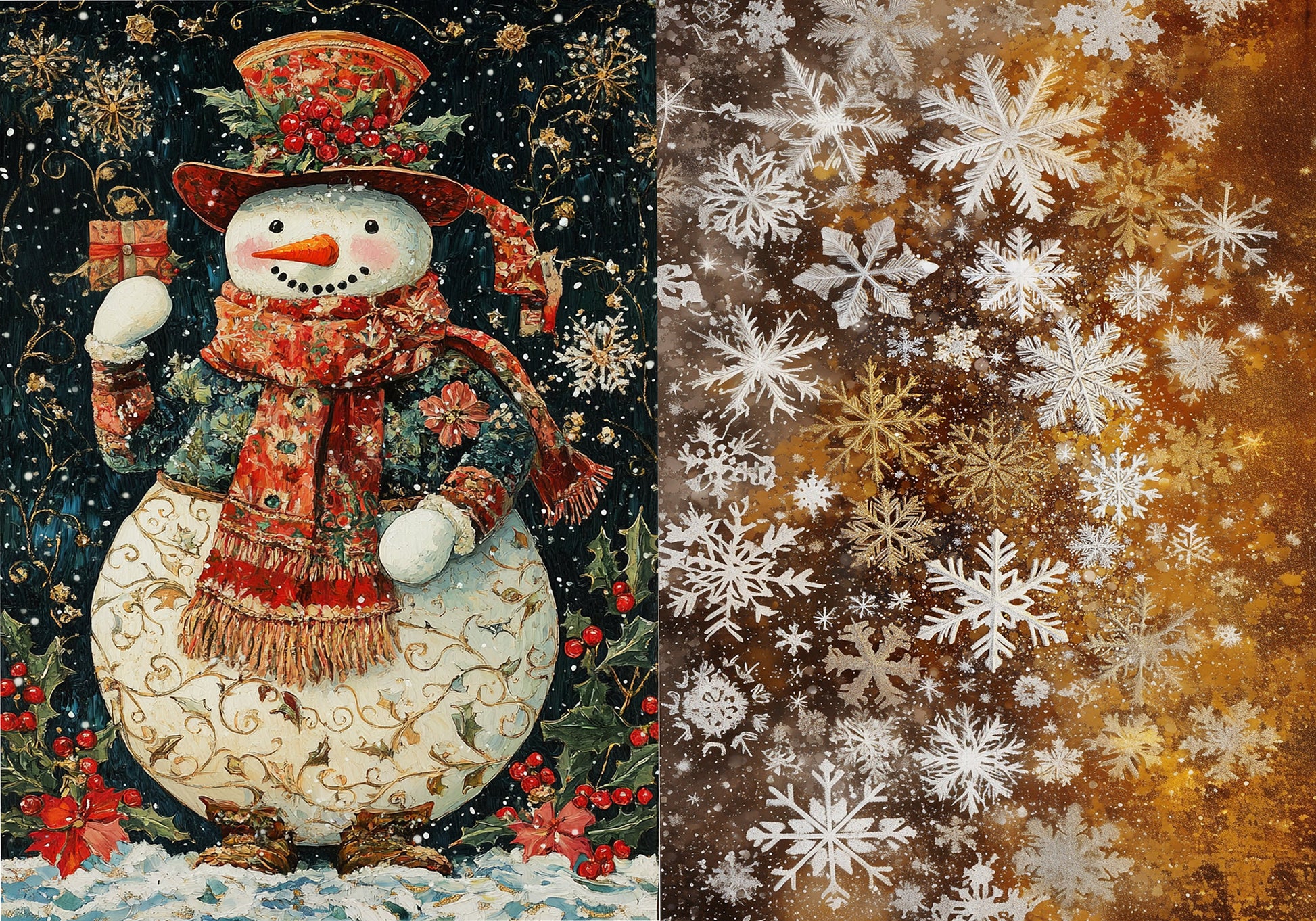Reba Rose Creations, Rice Paper for Decoupage, Mixed Media, Nostalgic Snowman, Snowflakes, Christmas, RR-99, A3, 11.7 x 16.5.