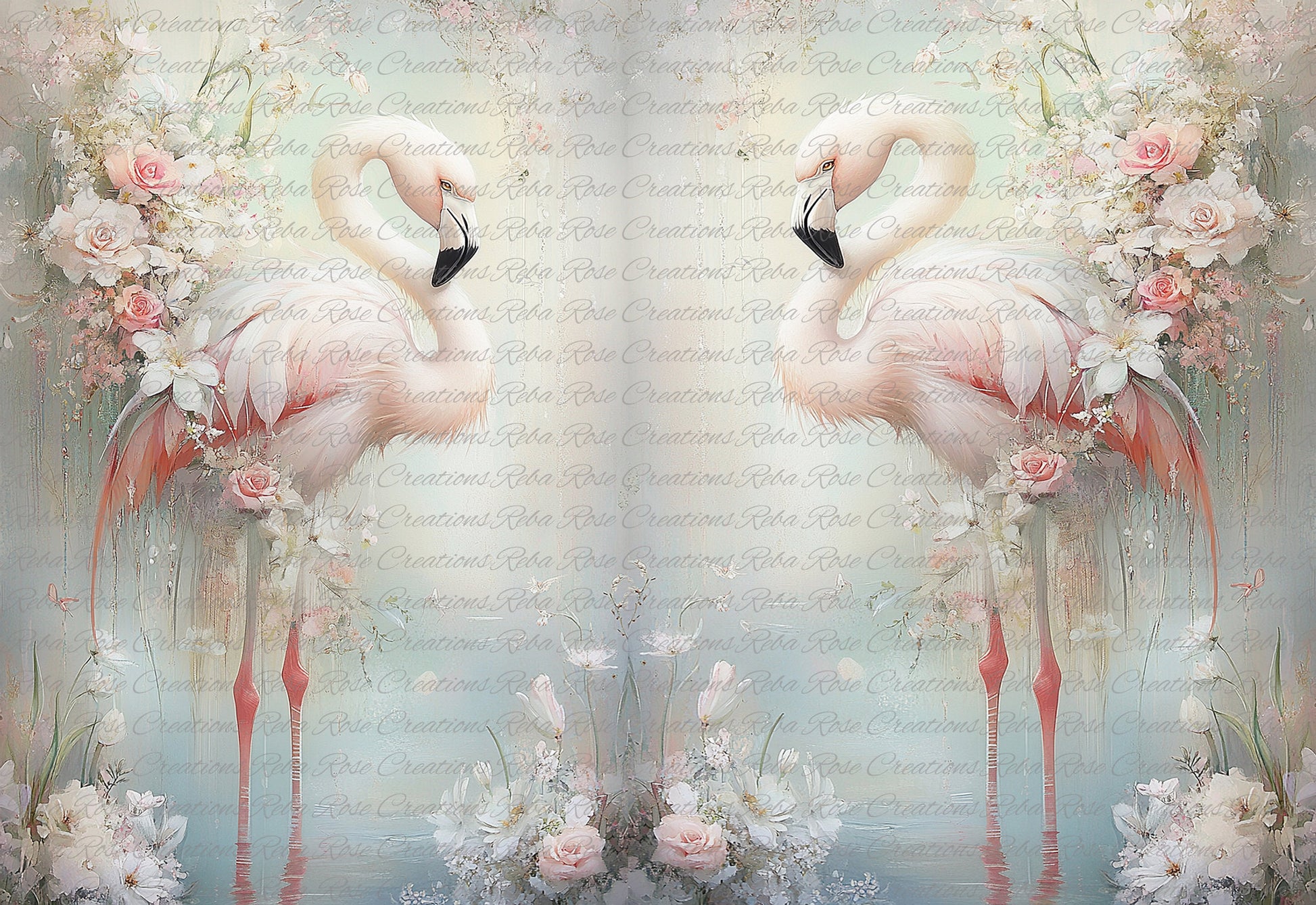 Reba Rose Creations, Rice Paper for Decoupage, Mixed Media, Pink Flamingos, Mirror Image, Flowers, A3, 11.7 x 16.5